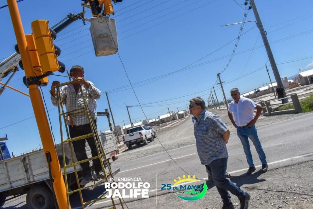 El municipio de 25 de Mayo, encabezado por el intendente Rodolfo Jalife, continúa avanzando en obras para optimizar el tránsito y la seguridad vial en el departamento. Este martes, junto al secretario de Obras y Servicios Públicos, José Reinoso, y el director de Asuntos Viales, Carlos Lucero, supervisó la instalación de semáforos inteligentes en la localidad de Casuarinas.