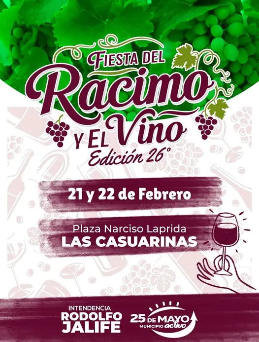 El próximo 21 y 22 de febrero, el departamento de 25 de Mayo se vestirá de fiesta para celebrar la 26ª edición de la Fiesta del Racimo y el Vino. La tradicional festividad, que rinde homenaje a los trabajadores vitivinícolas, tendrá lugar en la Plaza Narciso Laprida, en la localidad de Las Casuarinas.