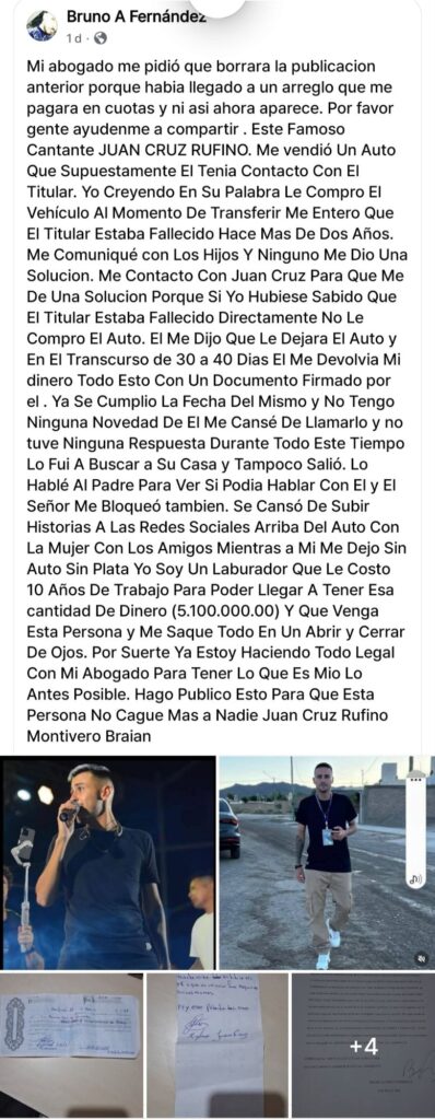 Bruno Fernández asegura que el músico lo tranquilizó, le pidió que le dejara el vehículo y prometió devolverle el dinero en 30 o 40 días. Firmaron un documento, pero cuando llegó la fecha pactada, no apareció más. “Me bloqueó de todos lados. Mientras yo estoy sin plata ni auto, él sube historias manejándolo como si nada”, escribió el damnificado.