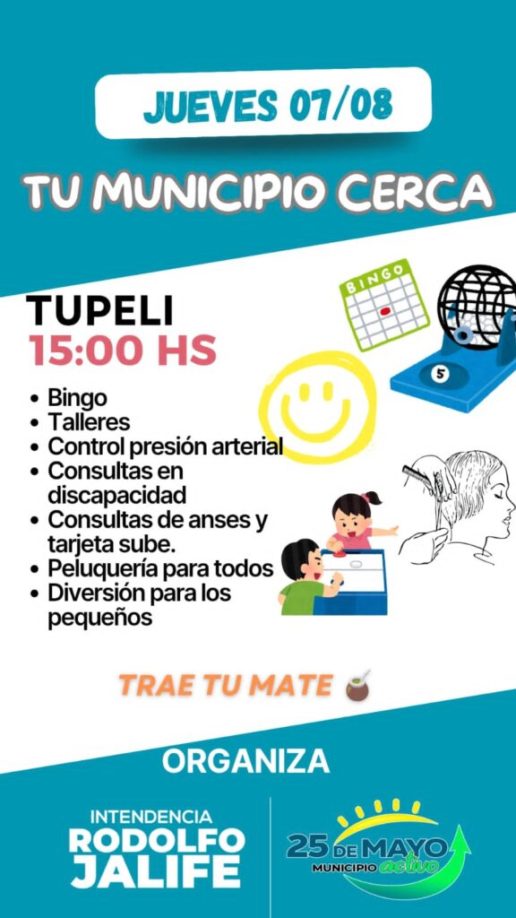 La Municipalidad de 25 de Mayo, bajo la gestión del intendente Rodolfo Jalife, llevará adelante una nueva edición de su programa itinerante “Tu Municipio Cerca”, esta vez en la localidad de Tupelí, el próximo jueves 7 de agosto desde las 15:00 horas.